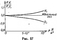 На графике (рис. 3) приведены некоторые данные по сжатию водорода и кислорода при температуре t0° = 0° С, с начальным давлением р0 = 105 (H/м2) и одинаковом начальном объеме V0 = 22,41 л.