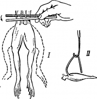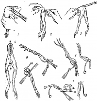 Лягушку обездвижьте. Возьмите ее левой рукой за бедра (в этом положении хорошо выделяется позвоночник) и перережьте позвоночник на 1—1,5 см выше места отхождения тазовых костей (рис. 18, 1). Свисающую переднюю часть туловища и внутренности удалите. Остаток позвоночника крепко держите пинцетом или левой рукой. Другим пинцетом захватите кожу около позвоночника и тяните ее вниз, чтобы, выворачивая, снять с конечностей (рис. 18, 2). Конечности положите на чистую тарелку и залейте раствором Рингера. Руки вымойте или тщательно вытрите от слизи, покрывающей кожу лягушки. Захватите пинцетом или рукой кусочек позвоночника и подогните его вниз так, чтобы конечности висели под углом к позвоночнику и хорошо выделялась копчиковая кость (рис. 18, 3).