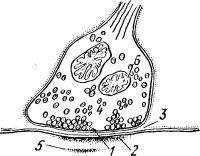 1 — пресинаптическая мембрана; 2 — постсинаптическая мембрана; 3 — синаптическая щель; 4 — синаптические пузырьки; 5 — нейропротофибриллы; 6 — митохондрии.
