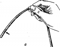 Берут катетер № 8— 12, делают в нем несколько дополнительных отверстий, отступя от закругленного конца (рис. 57, а). Катетер должен пройти носовые ходы и попасть в заднеглоточное пространство. Расстояние это приблизительно равно расстоянию от кончика носа больного до мочки уха (рис. 57, б); следует заранее отметить его, приклеив к катетеру полоску лейкопластыря.