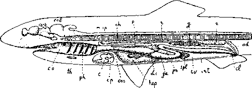 В самом деле глотка пронизывается жаберными отверстиями, поддерживаемыми жаберными дугам, на которых у многих рыб расположены листки самих жабер.