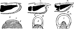 Рис. 249. Схемы: А—ногтя, В—когтя, С—копыта, е—подушечка пальца; n—ногтевая пластинка, s—подошвенная пластинка.