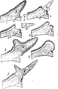 На костных выростах лобных костей у многих копытных млекопитающих имеются рога. Обыкновенно в месте образования рогов слой кожи (corium) тесно срастается с надкостницей лобных костей. Эта надкостница дает начало окостенению рога. У полорогих рога образуются в виде отдельной кожной кости (os cornu), срастающейся с небольшим выступом лобной кости. У оленей выступы лобных костей вместе с corium дают начало постоянному основанию рога, так называемой р оз е т к е. От этой розетки растет цельный (неполый) рог, первоначально одетый волосами и питаемый кровеносными сосудами (ветвями arteria temporalis). Такой простой неветвящийся рог молодого оленя называется спицей (рис.2 ,1). С возрастом на спице появляются боковые отростки; чем старше олень, тем больше этих отростков. Однако прямого соотношения между появлением нового отростка и годом дальнейшей жизни животного нет. Другими словами,по числу отростков нельзя судить о возрасте оленя. У некоторых видов рог остается на примитивной стадии спицы в течение всей жизни животного (например, у оленей pp. Mazama, Goriacus). У вполне сформировавшегося рога его основное вещество делается твердым, поверхностная, покрытая волосами кожа стирается (олень трется рогами о сучья, камни); питание кровеносными сосудами прекращается. Олени ежегодно ранней весной сбрасывают рога (часть рогов, соответствующую спицам, простым или ветвящимся; розетки остаются нетронутыми). Сбрасывание обусловливается появлением полостей