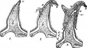 1—вскоре после сброса роговой оболочки (чехла); 2—более поздняя стадия с образованием переднего рогового отростка (у); 3—под старым роговым чехлом, отделившимся от его основы, возникает новый волосяной покров и новый роговой чёхлик (v‘); м—первый роговой отросток; х—второй роговой отросток; z—основание рогового чехла; b—костный лобный вырост; е—эпидермис; с—кожный покров; h—лобная кость.