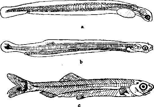 Вышедшие личинки имеют длину 5,3—7,0 мм (рис. 1, ); первое время они лежат на дне, пока не рассосется желточный мешок, затем начинают плавать и претерпевают ряд превращений.