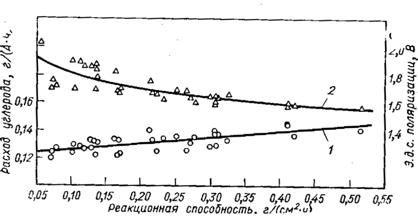Рис. 24. Зависимость расхода углерода (1), э.д.с. поляризации (2) от реакционной способности угольного анода в условиях электролиза криолито-глиноземных расплавов (Ведерников)