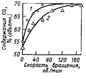 Рис. 26. Влияние скорости вращения мешалки на выход СО при взаимодействии алюминия, растворенного в электролите, с СO2: 1 — чистый алюминий; 2 — сплав алюминия с 50% (по массе) меди