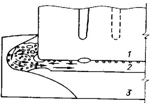 Рис. 39. Общая картина гидродинамических явлений в вертикальном сечении электролизера ВТ: 1- анод, 2- электролит, 3- алюминий