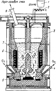 1 — загрузочный бункер; 2 — шненовый питатель; 3 — футеровка из шамота; 4 — фурмы для подачи хлора; 5 — летка для выпуска расплава; 6 — корпус; 7 —пусковые графитовые электроды; 8 — газоход.